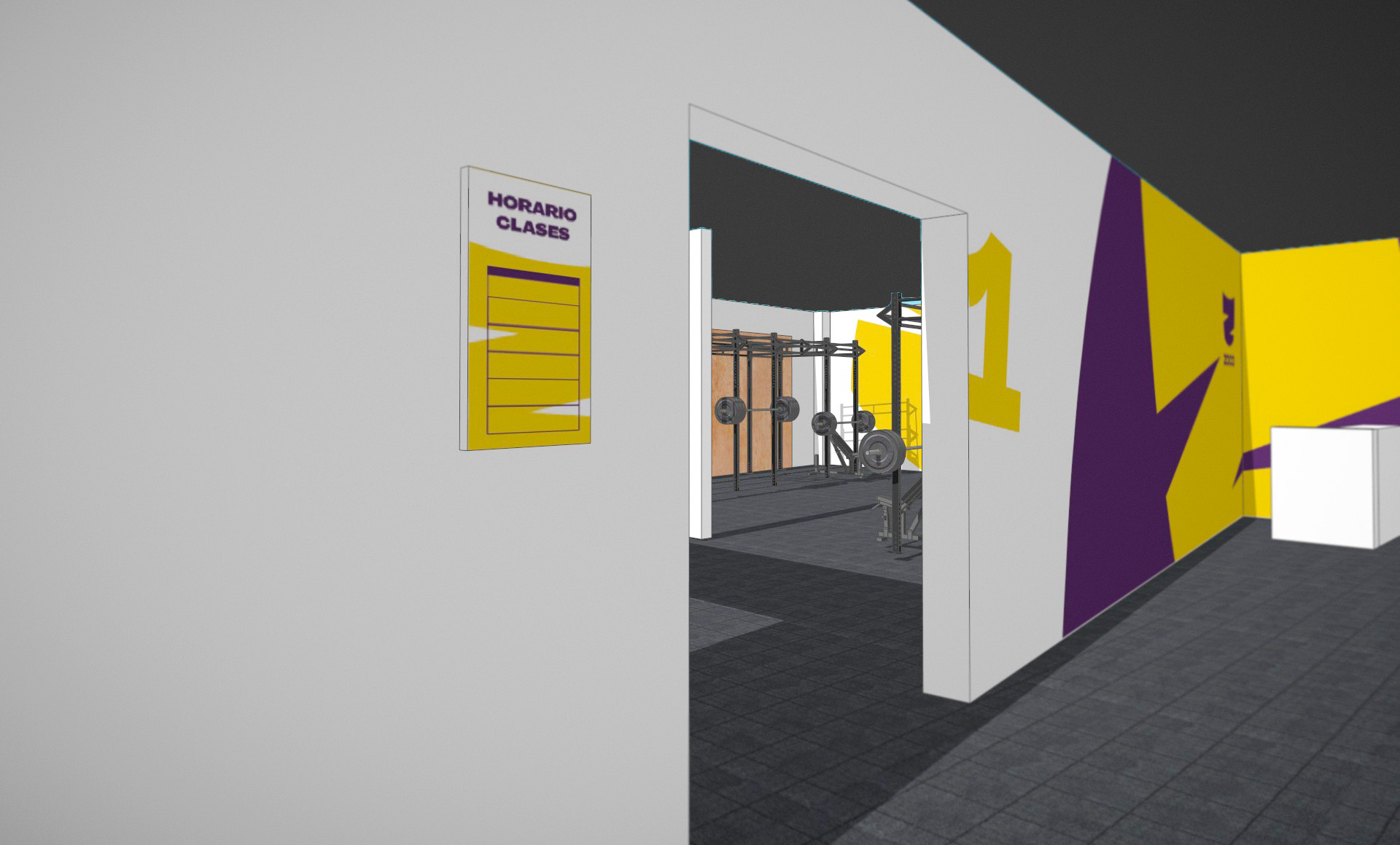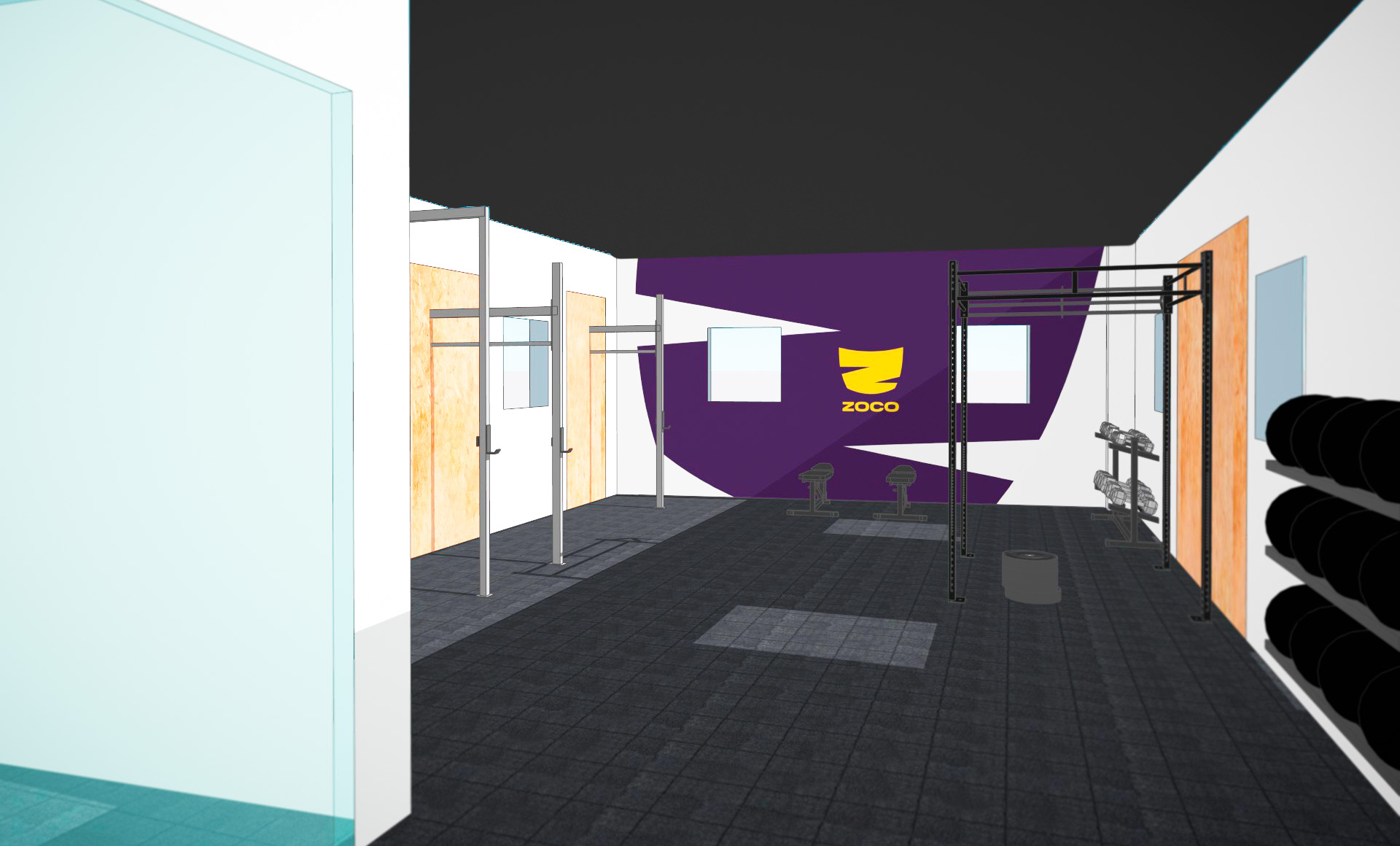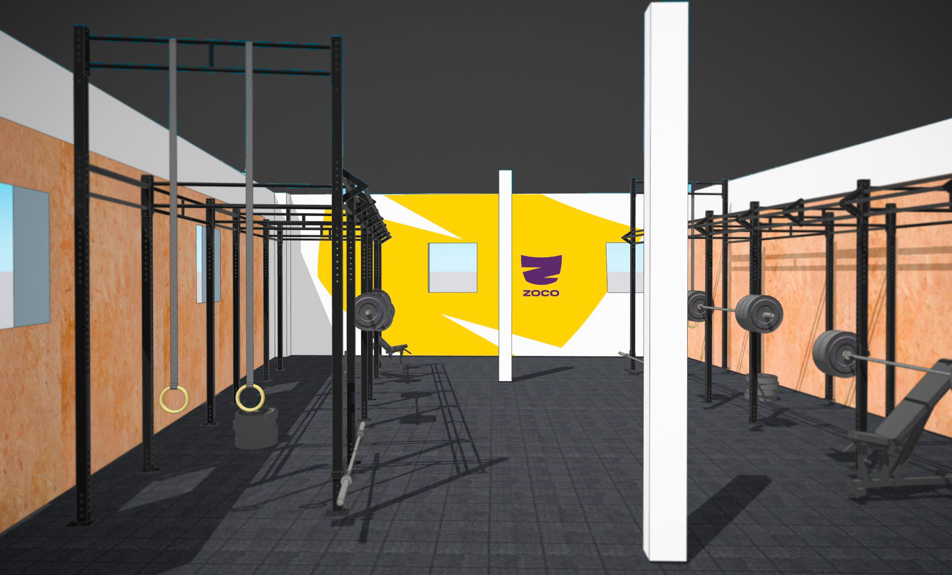 En el diseño y decoración del espacio se prestó especial importancia a la luminosidad del entorno, alejándose del espacio cerrado y oscuro de los locales actuales para este tipo de sistema de entrenamiento. Usando el símbolo de la marca, los espacios creados son dinámicos, coloridos y luminosos para fomentar el entorno deportivo y la práctica del deporte para cualquier público. El resultado combina color, movimiento y personalidad respetando la esencia del local y su entorno de barrio. Zoco Crossfit pretende ir más allá del entorno deportivo masculinizado o con una estética agresiva para abrir el entrenamiento a un público más amplio, que mantenga el sentimiento de comunidad pero abrazando la inclusión y el lugar de reunión para todo nivel y forma física.